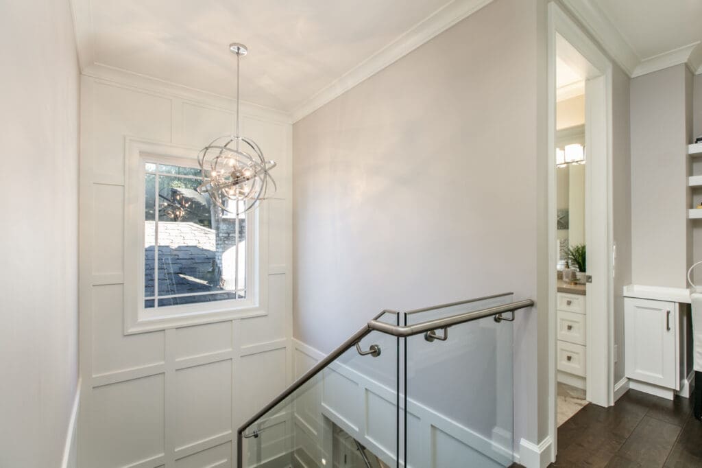 The dark brown flooring adds richness to the living spaces, complementing the classic ambiance. The glass staircase railing creates an eye-catching centerpiece, blending modernity with traditional elements.